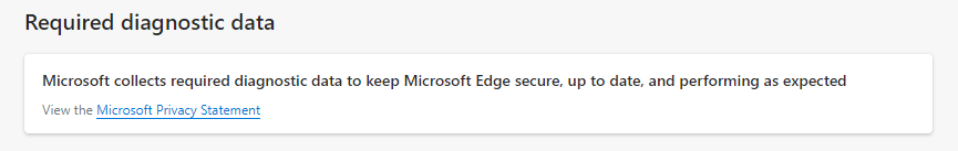 I decided to check in the Edge GUI to see if there was perhaps a more valid option to select from – and sure enough, there isn’t! It appears that they now force you to send “diagnostic data” telemetry back to MS – and you cannot disable it!